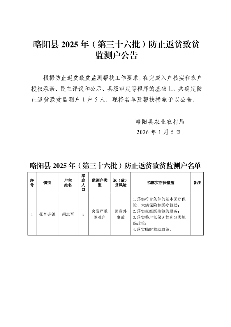 略阳县2025年(第三十六批)防止返贫致贫监测户公告