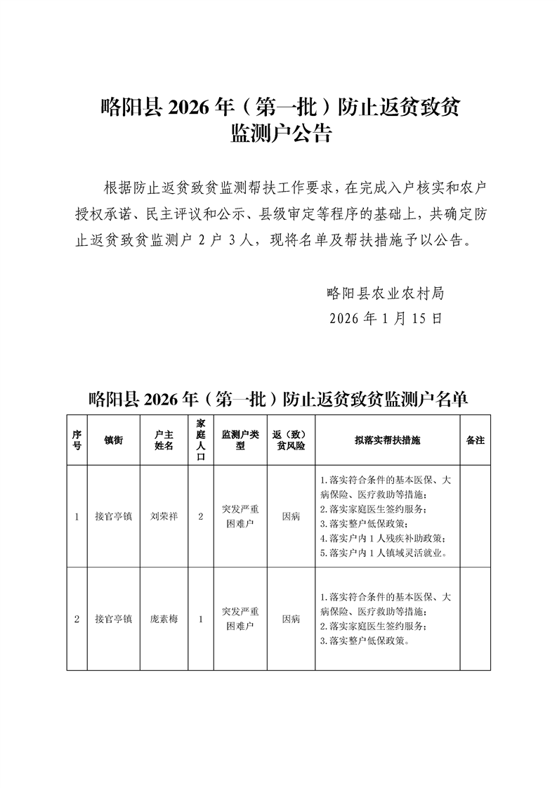 略阳县2026年(第一批)防止返贫致贫监测户公告