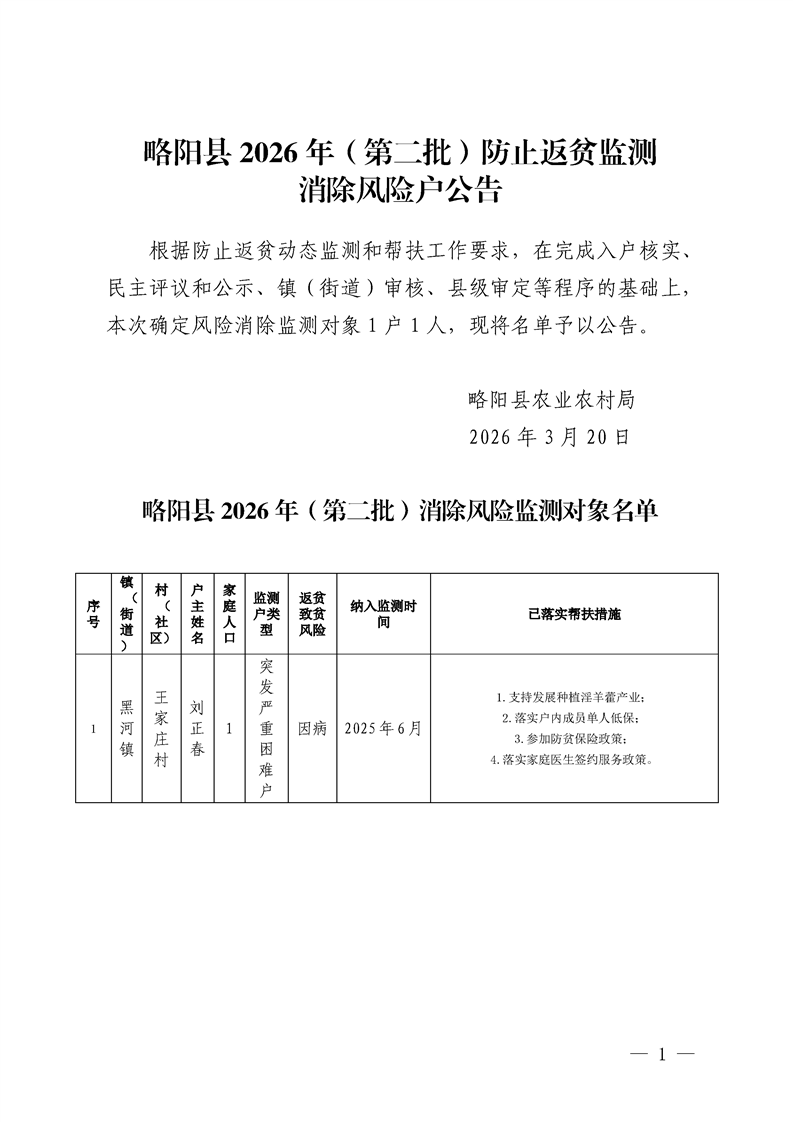 略阳县2026年(第二批)防止返贫监测消除风险户公告