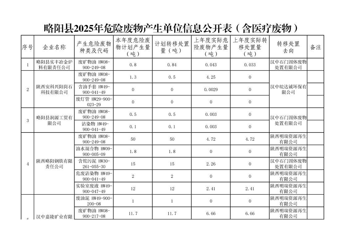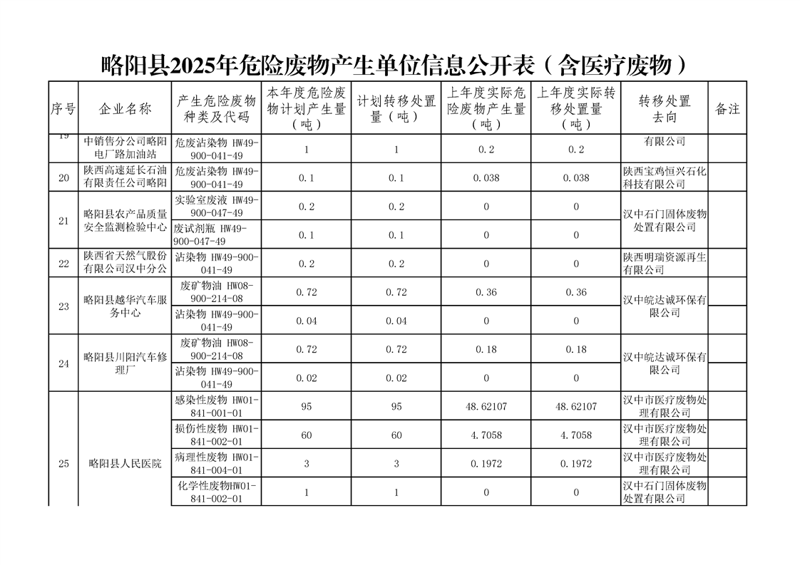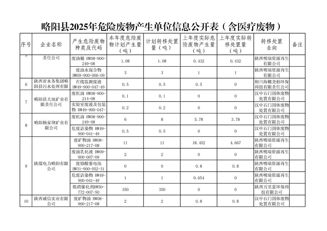 略阳县2025年危险废物产生单位信息公开(含医疗废物)