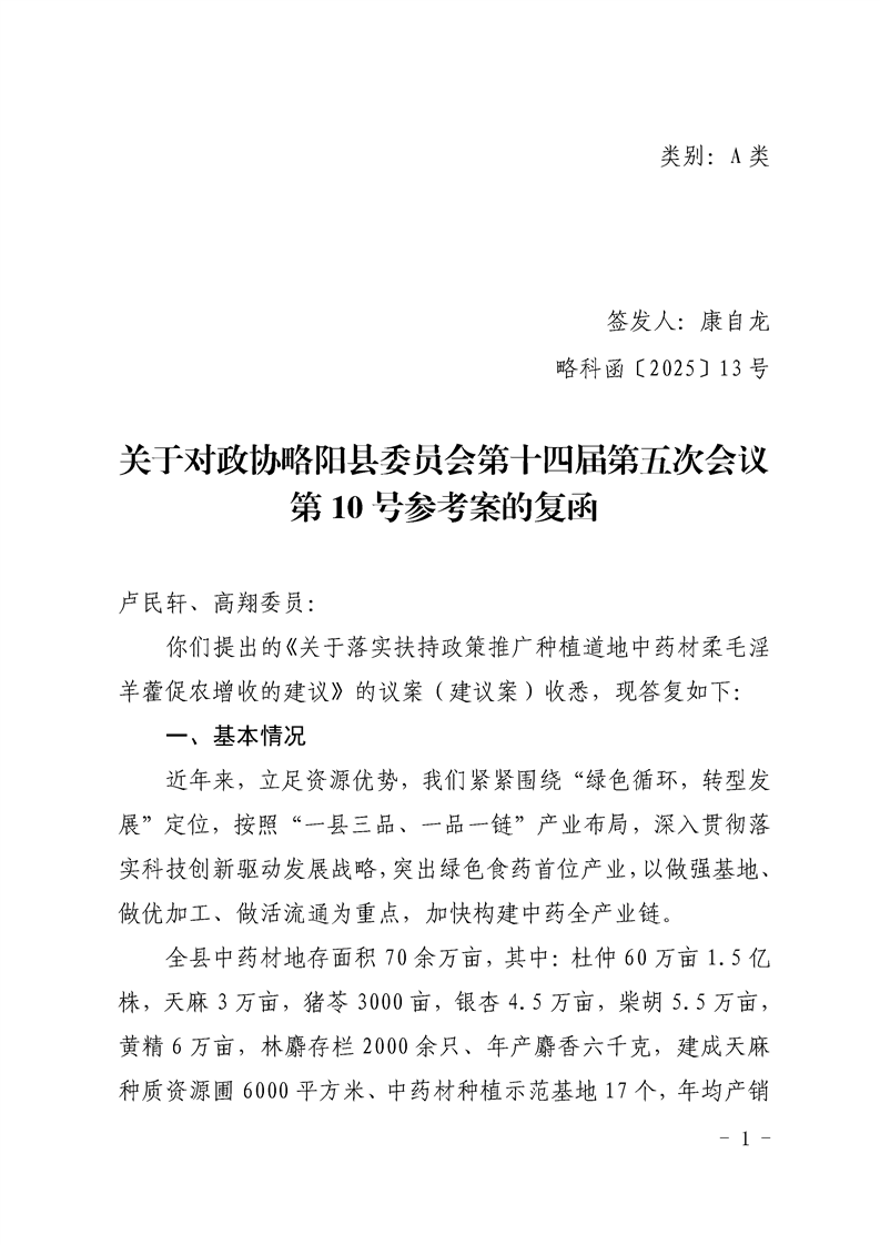 关于对政协略阳县委员会第十四届第五次会议第10号参考案的复函
