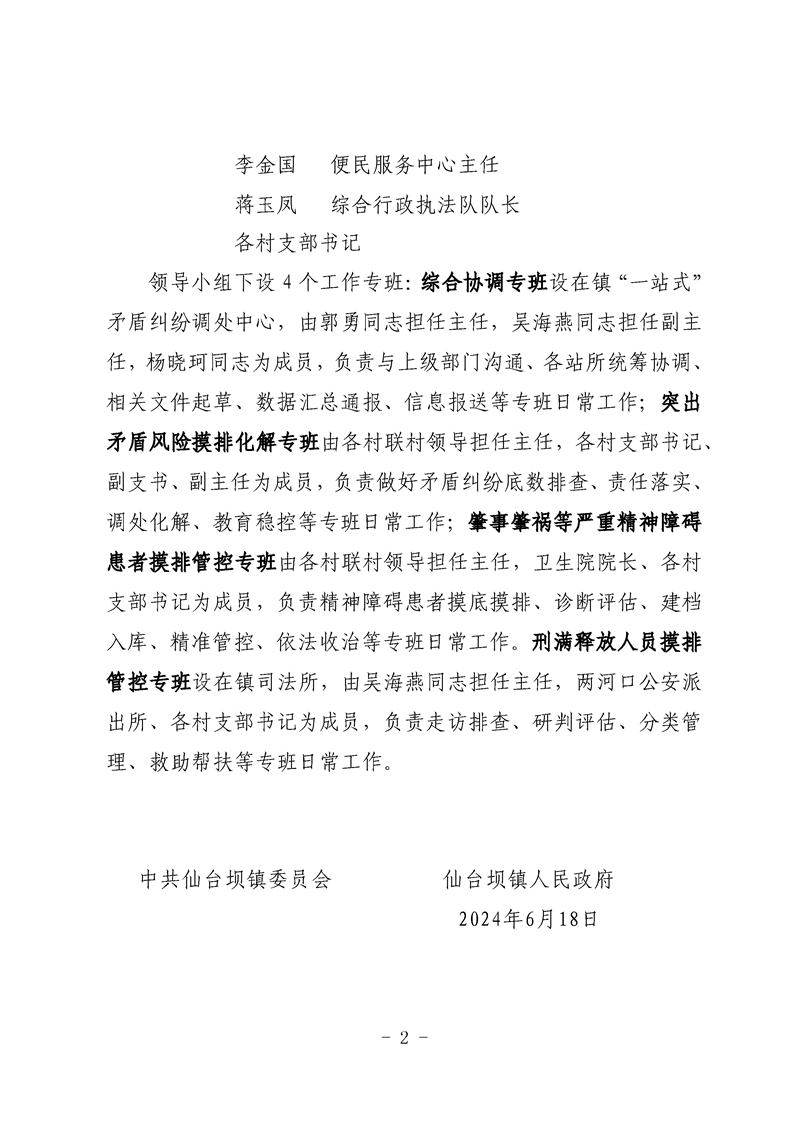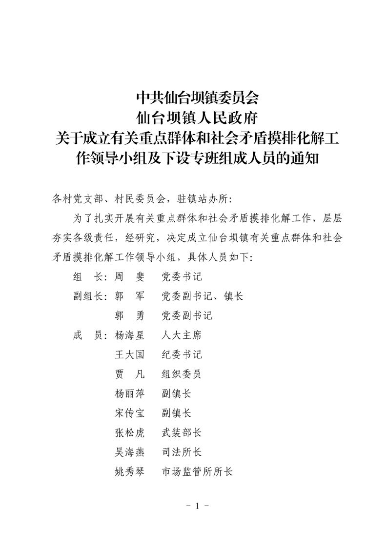 中共仙台坝镇委员会 仙台坝镇人民政府 关于成立有关重点群体和社会矛盾摸排化解工作领导小组及下设专班组成人员的通知