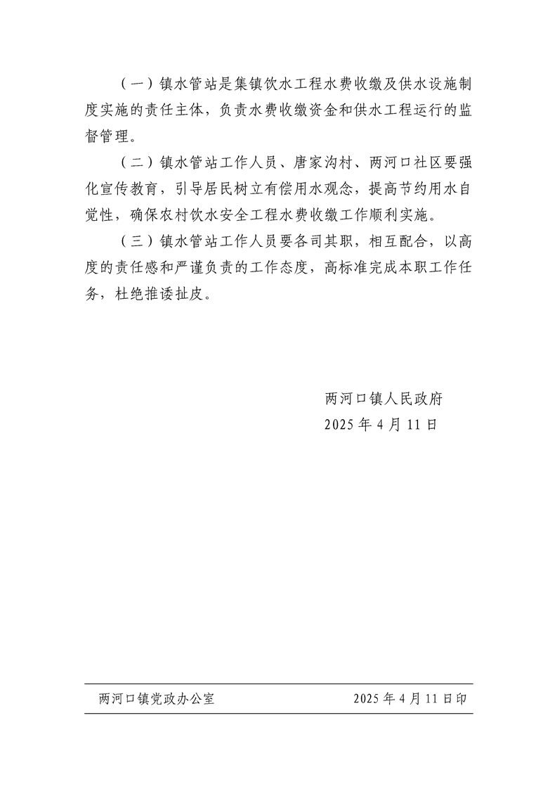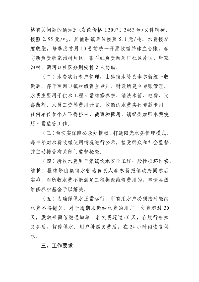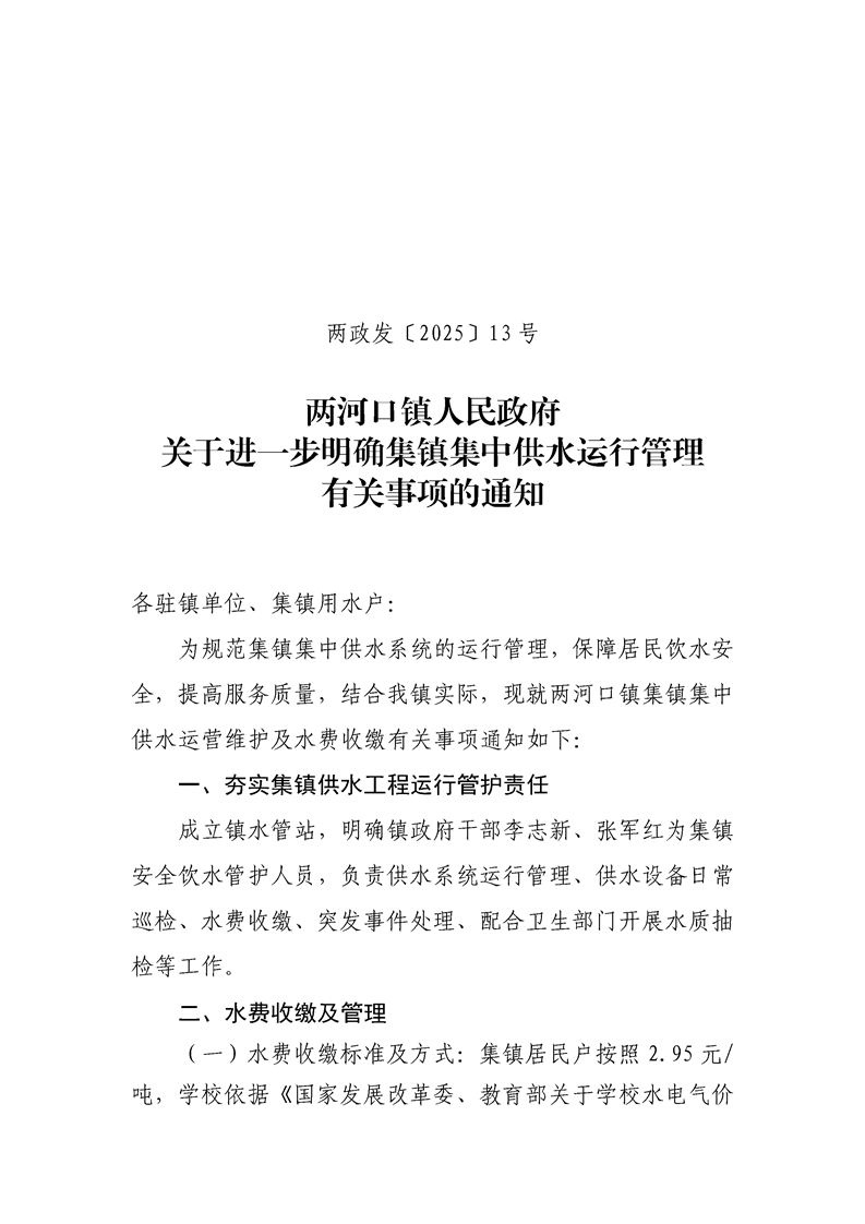 两河口镇人民政府关于进一步明确集镇集中供水运行管理有关事项的通知