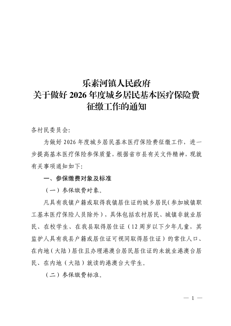 乐素河镇人民政府关于做好2026年度城乡居民基本医疗保险费征缴工作的通知