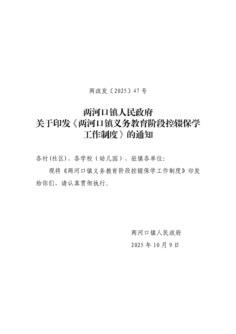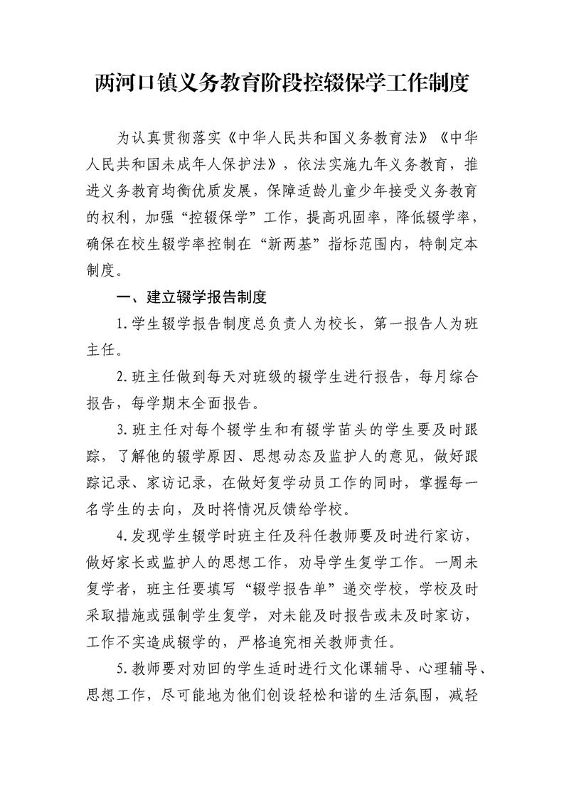 两河口镇人民政府关于印发《两河口镇义务教育阶段控辍保学工作制度》的通知
