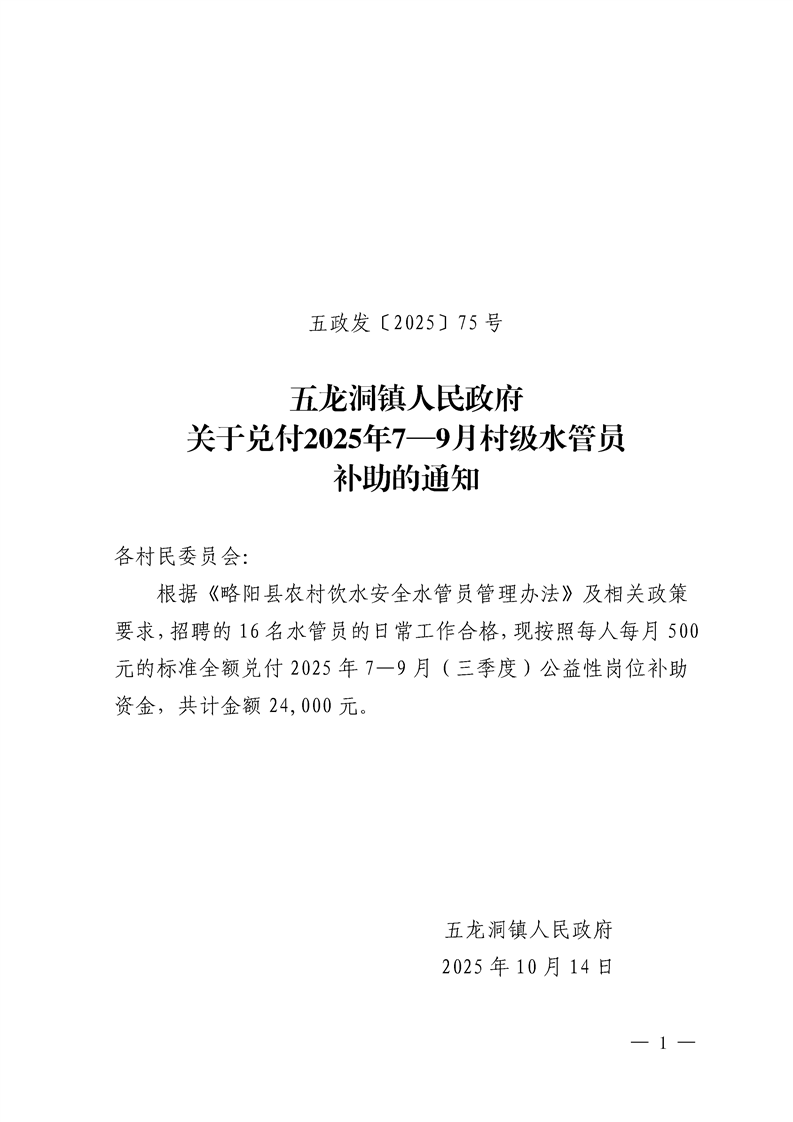 五龙洞镇人民政府关于兑付2025年7—9月村级水管员补助的通知