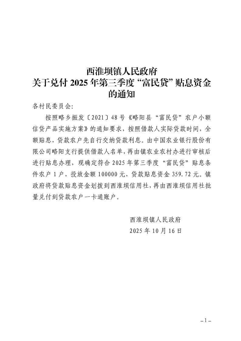 关于兑付2025年第三季度富民贷贴息资金的通知