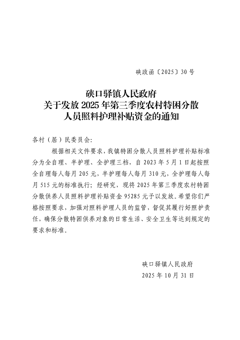 硖口驿镇人民政府关于发放2025年第三季度农村特困分散人员照料护理补贴资金的通知