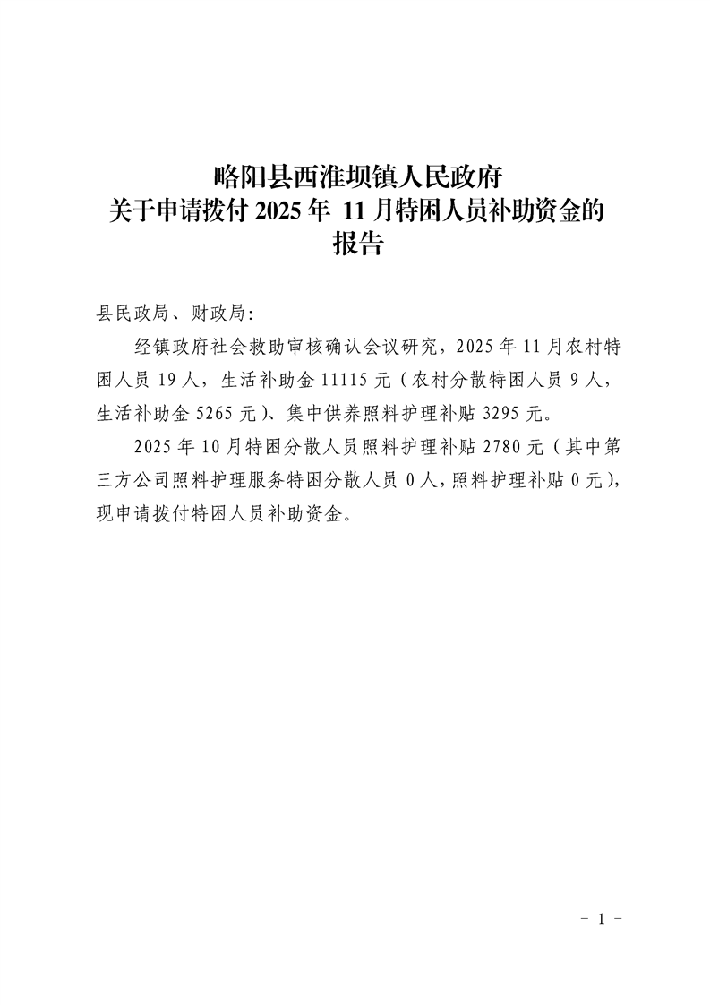 关于申请拨付2025年 11月特困人员补助资金的报告