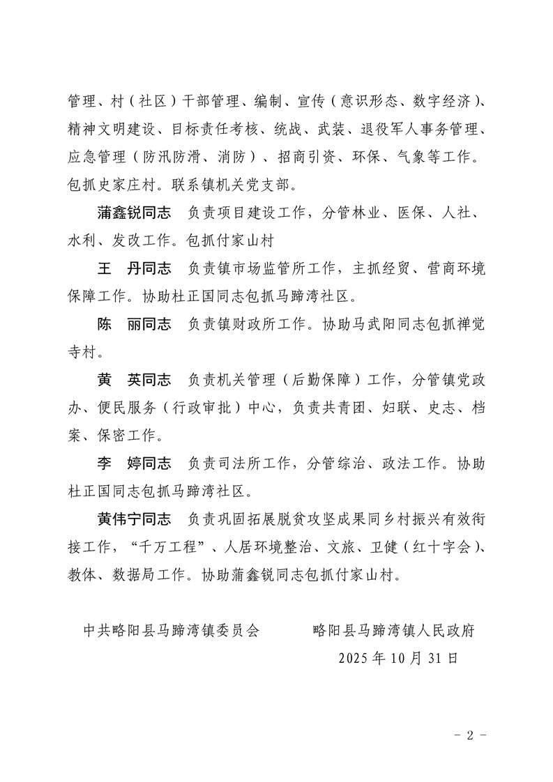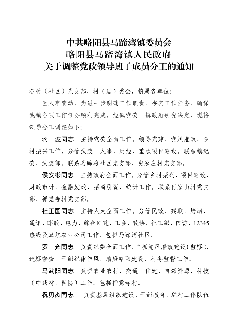 中共略阳县马蹄湾镇委员会略阳县马蹄湾镇人民政府关于调整镇领导班子成员分工的通知