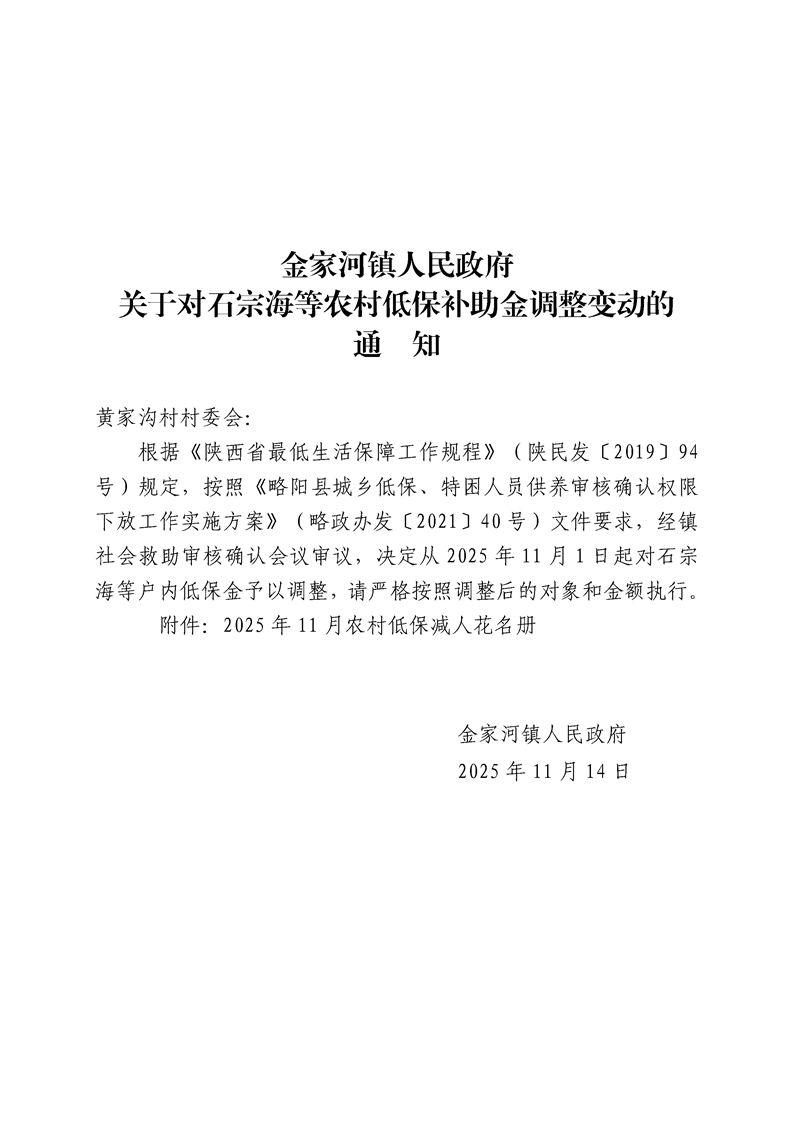金家河镇人民政府关于对石宗海等农村低保补助金调整变动的通知