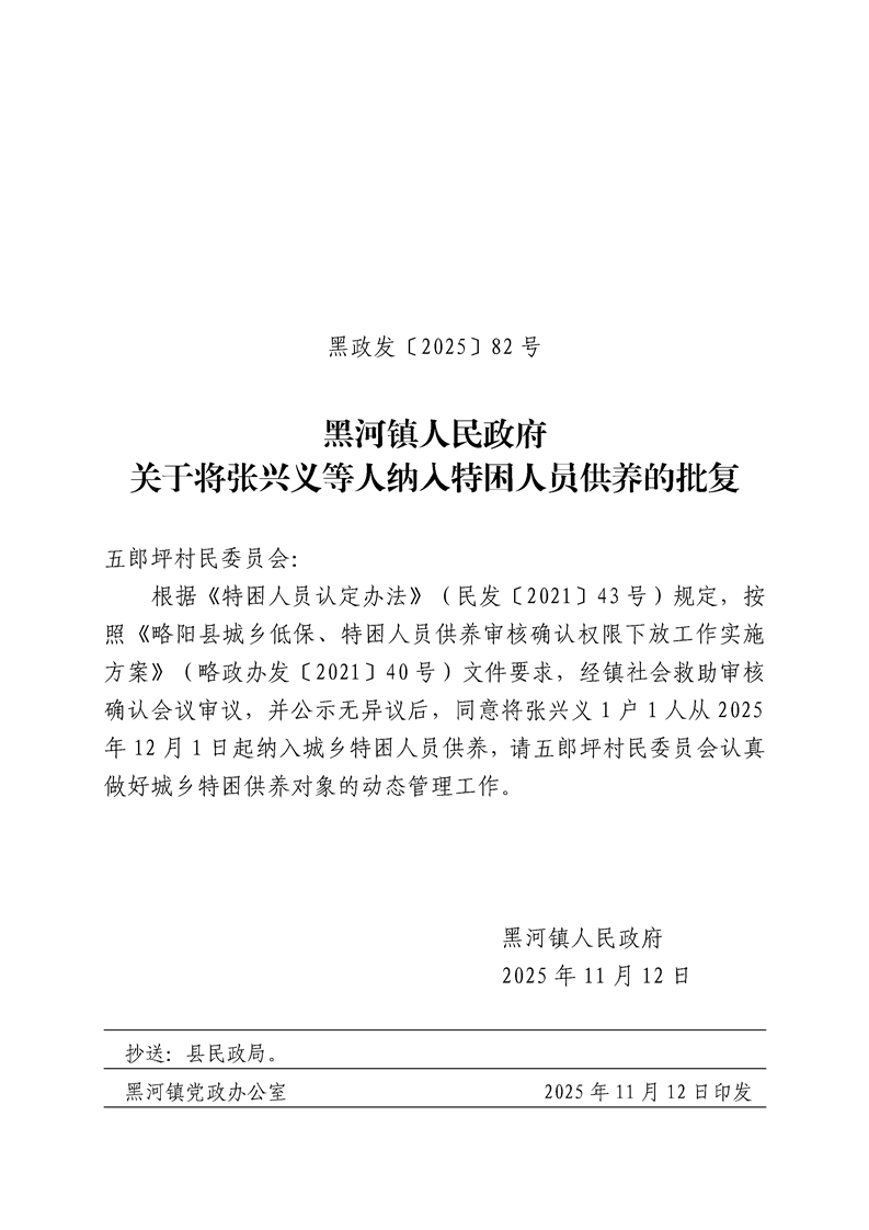 黑河镇人民政府关于将张兴义等人纳入特困人员供养的批复