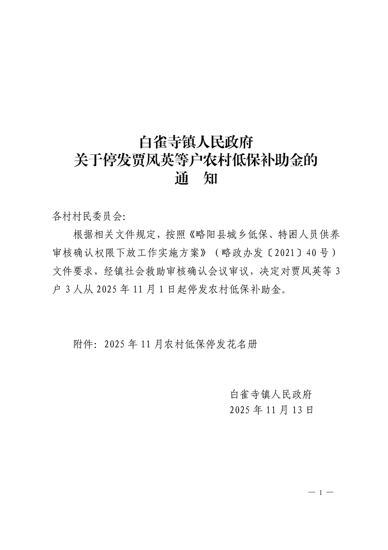 白雀寺镇人民政府关于停发贾风英等户农村低保补助金的通知