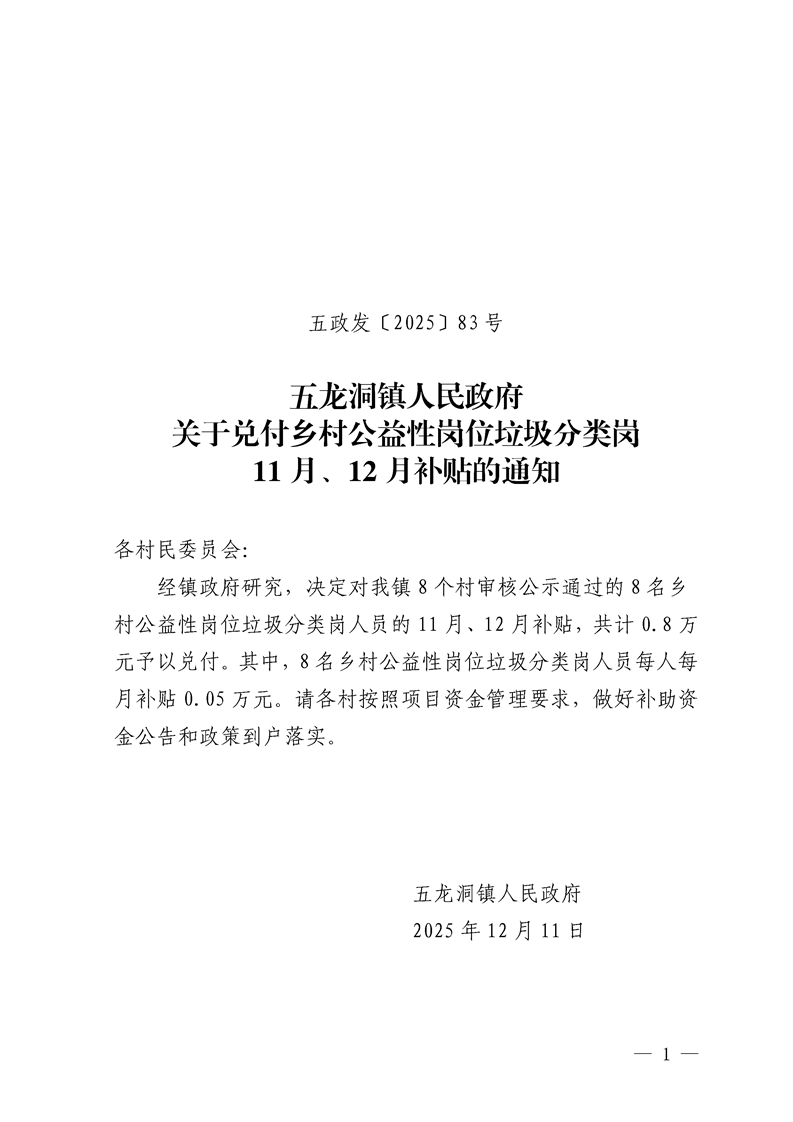 五龙洞镇人民政府关于兑付乡村公益性岗位垃圾分类岗11月、12月补贴的通知