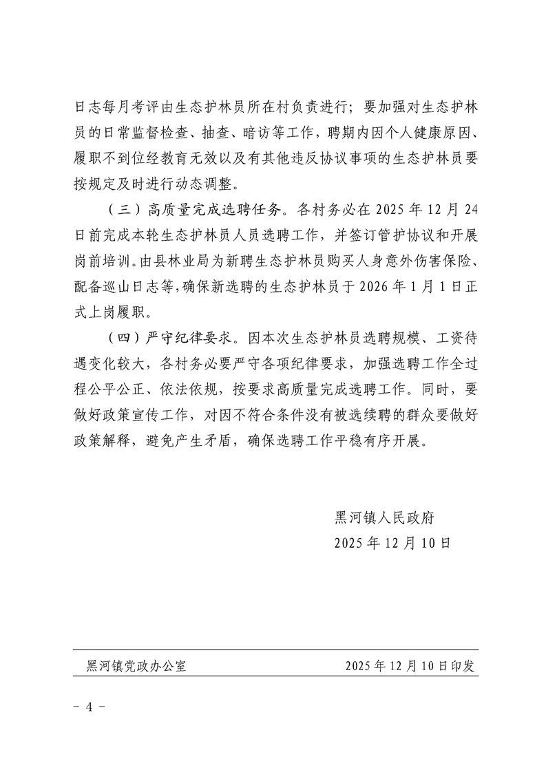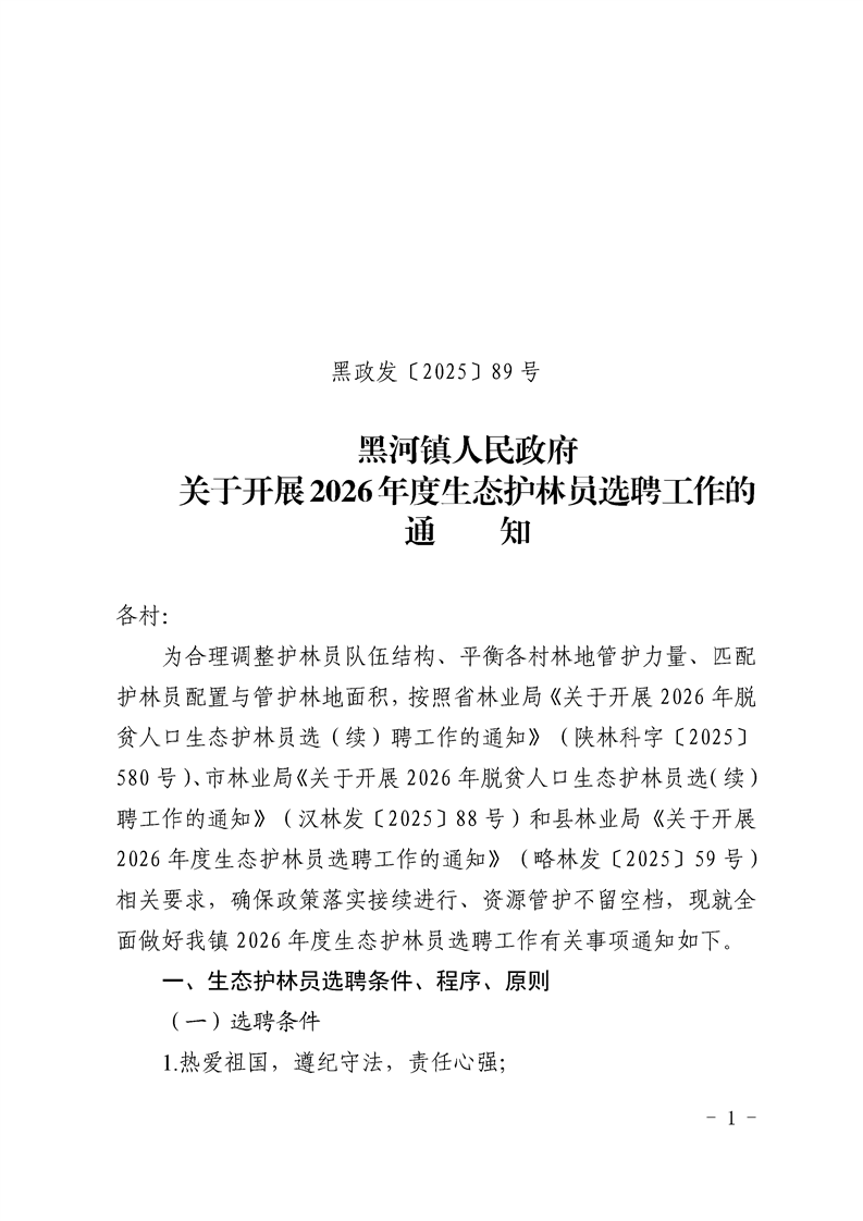 黑河镇人民政府关于开展2026年度生态护林员选聘工作的通知