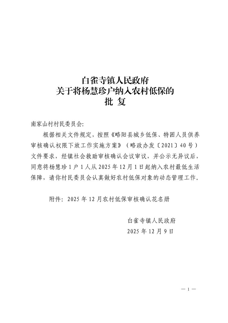 白雀寺镇人民政府关于将杨慧珍户纳入农村低保的批复
