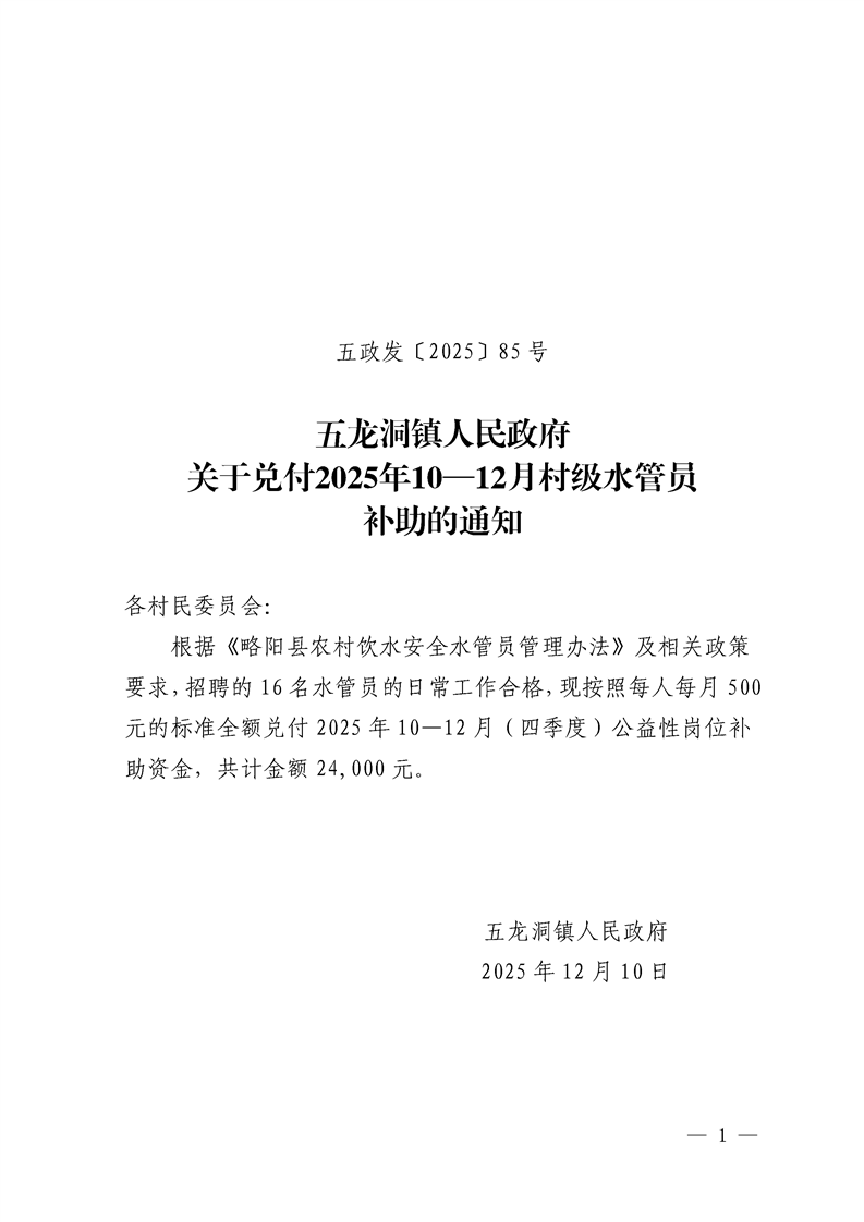 五龙洞镇人民政府关于兑付2025年10—12月村级水管员补助的通知
