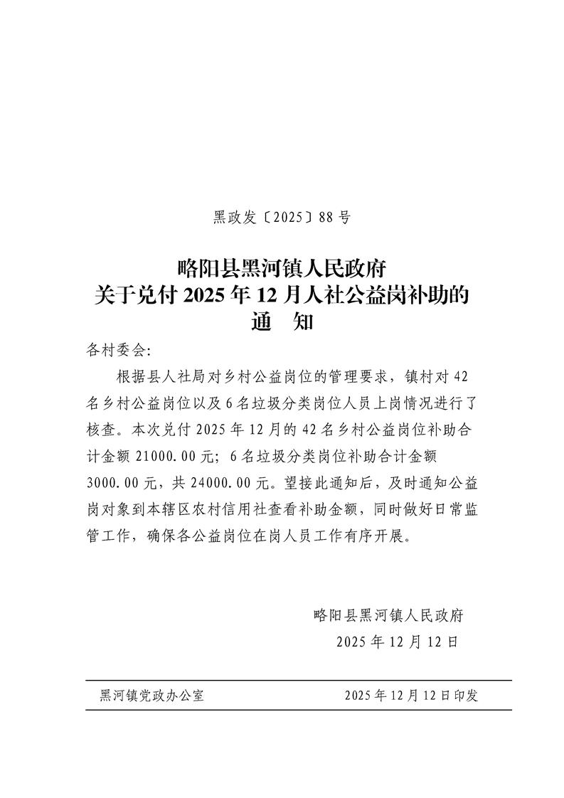 略阳县黑河镇人民政府关于兑付2025年12月人社公益岗补助的通知