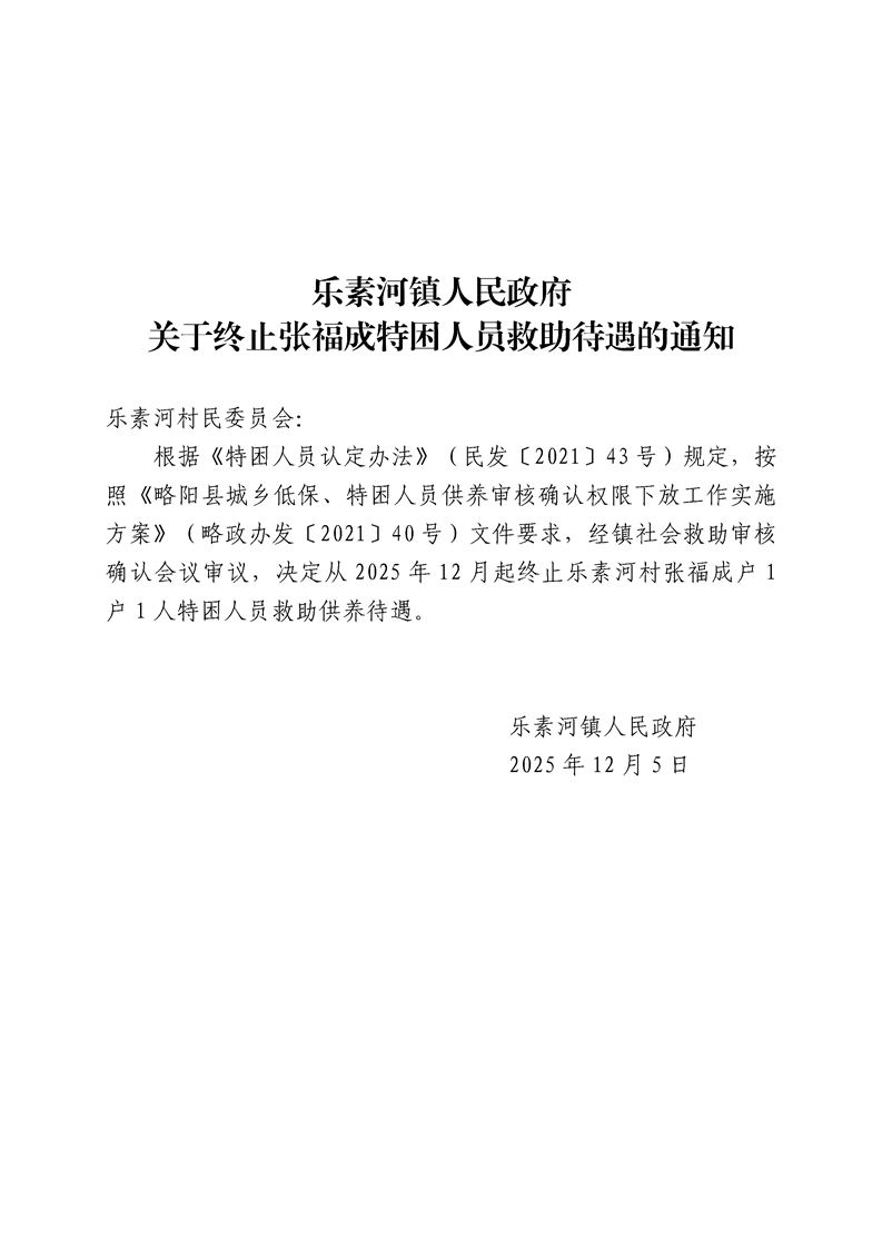 乐素河镇人民政府关于终止张福成特困人员救助供养待遇的通知