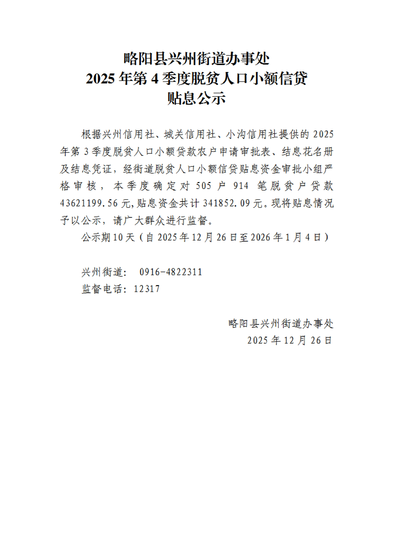 略阳县兴州街道办事处2025年第4季度脱贫人口小额信贷贴息公示