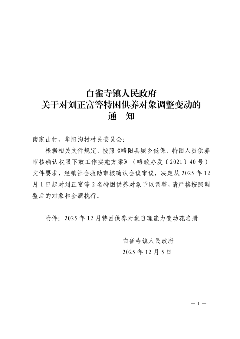 白雀寺镇人民政府关于对刘正富等特困供养对象调整变动的通知