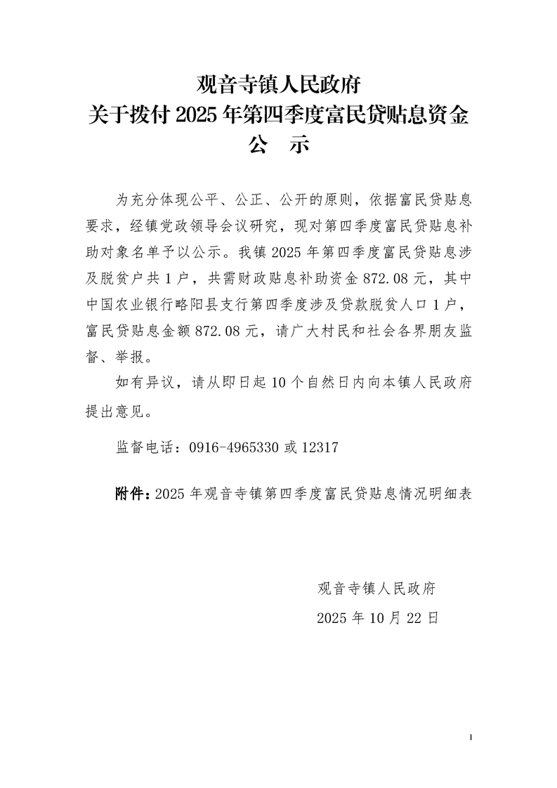观音寺镇人民政府关于拨付2025年第四季度富民贷贴息资金公 示