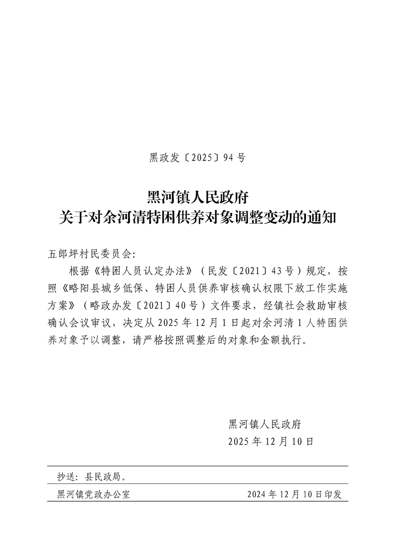 黑河镇人民政府关于对余河清特困供养对象调整变动的通知