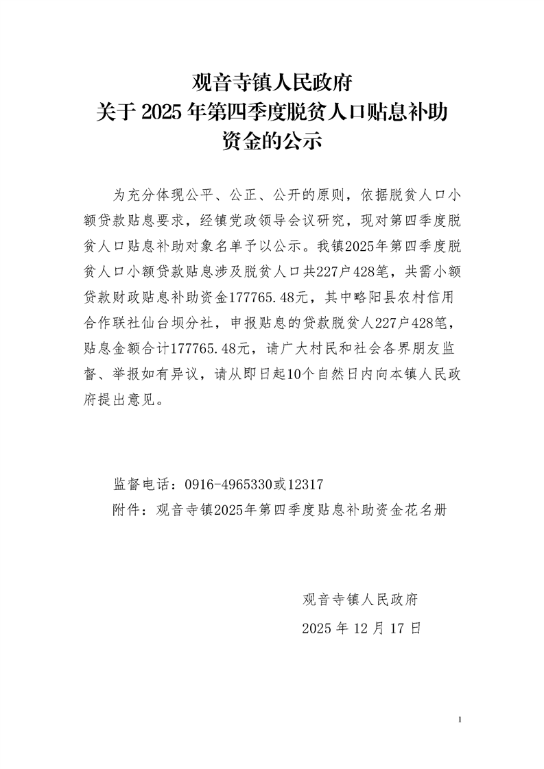 观音寺镇人民政府关于2025年第四季度脱贫人口贴息补助资金的公示