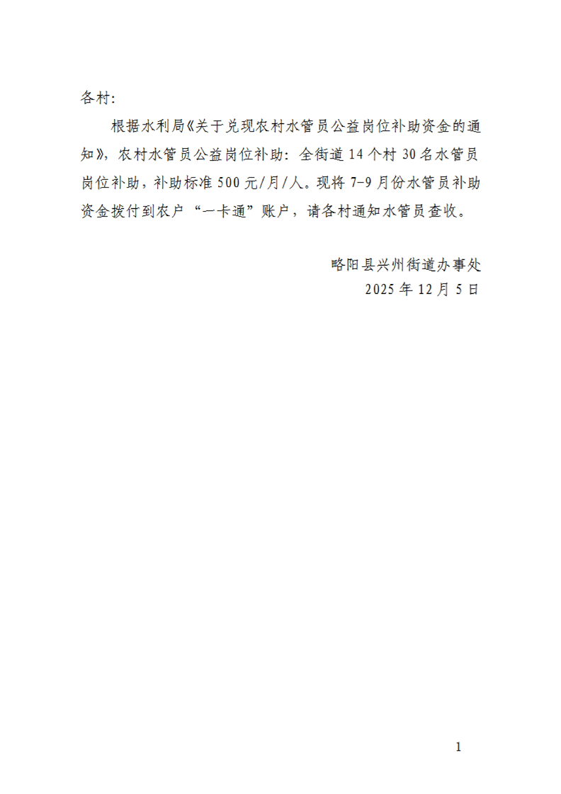 略阳县兴州街道办事处关于兑现农村水管员公益岗位补助资金的通知