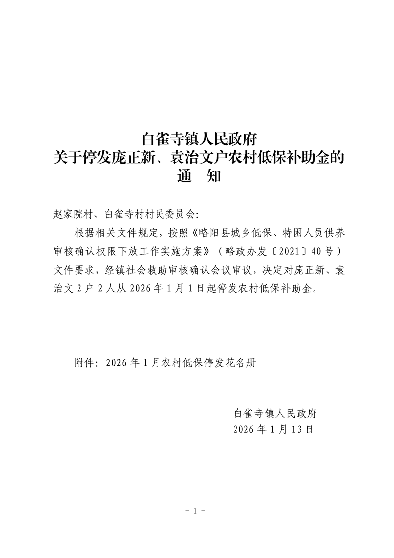 白雀寺镇人民政府关于停发庞正新、袁治文户农村低保补助金的通知