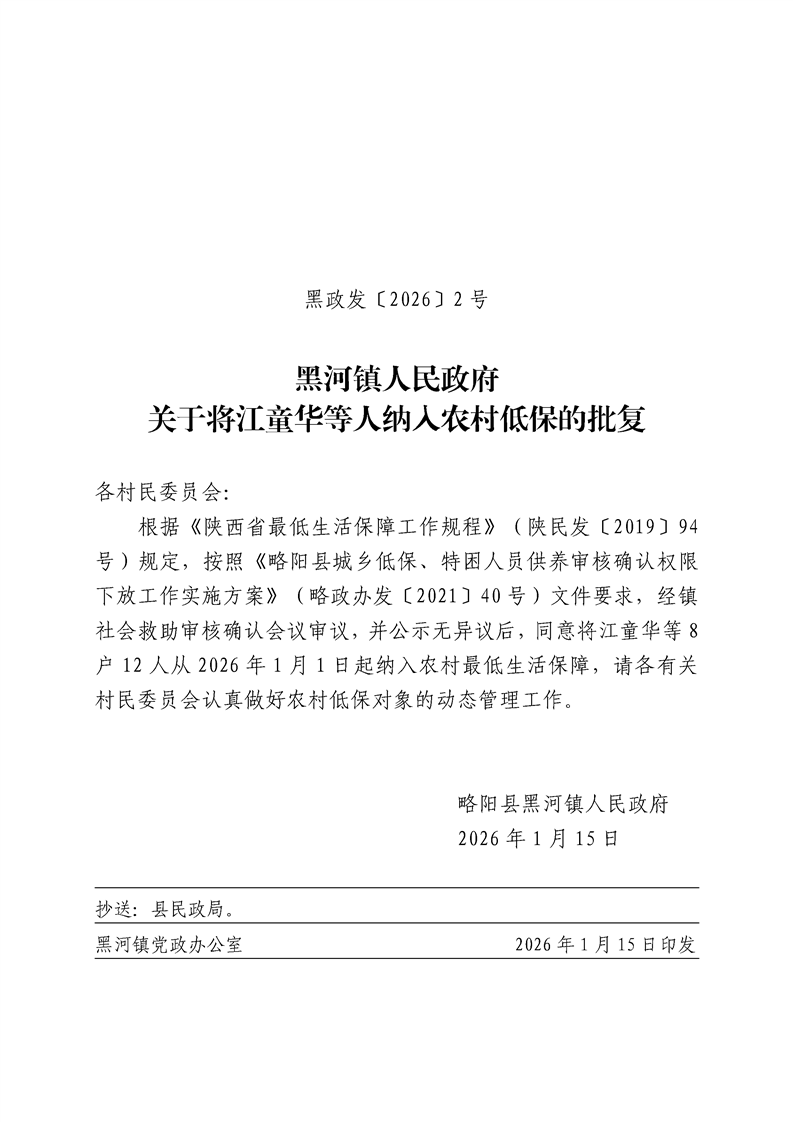 黑河镇人民政府关于将江童华等人纳入农村低保的批复