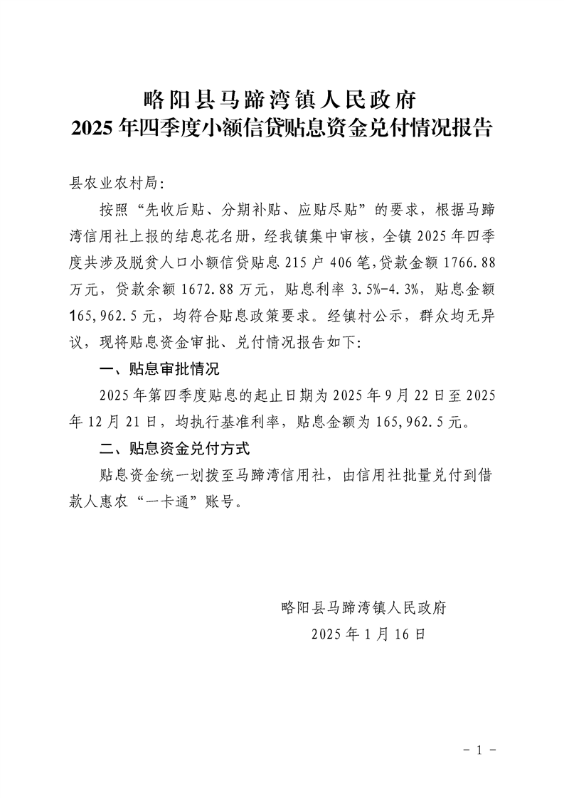 略阳县马蹄湾镇人民政府2025年四季度小额信贷贴息资金兑付情况报告