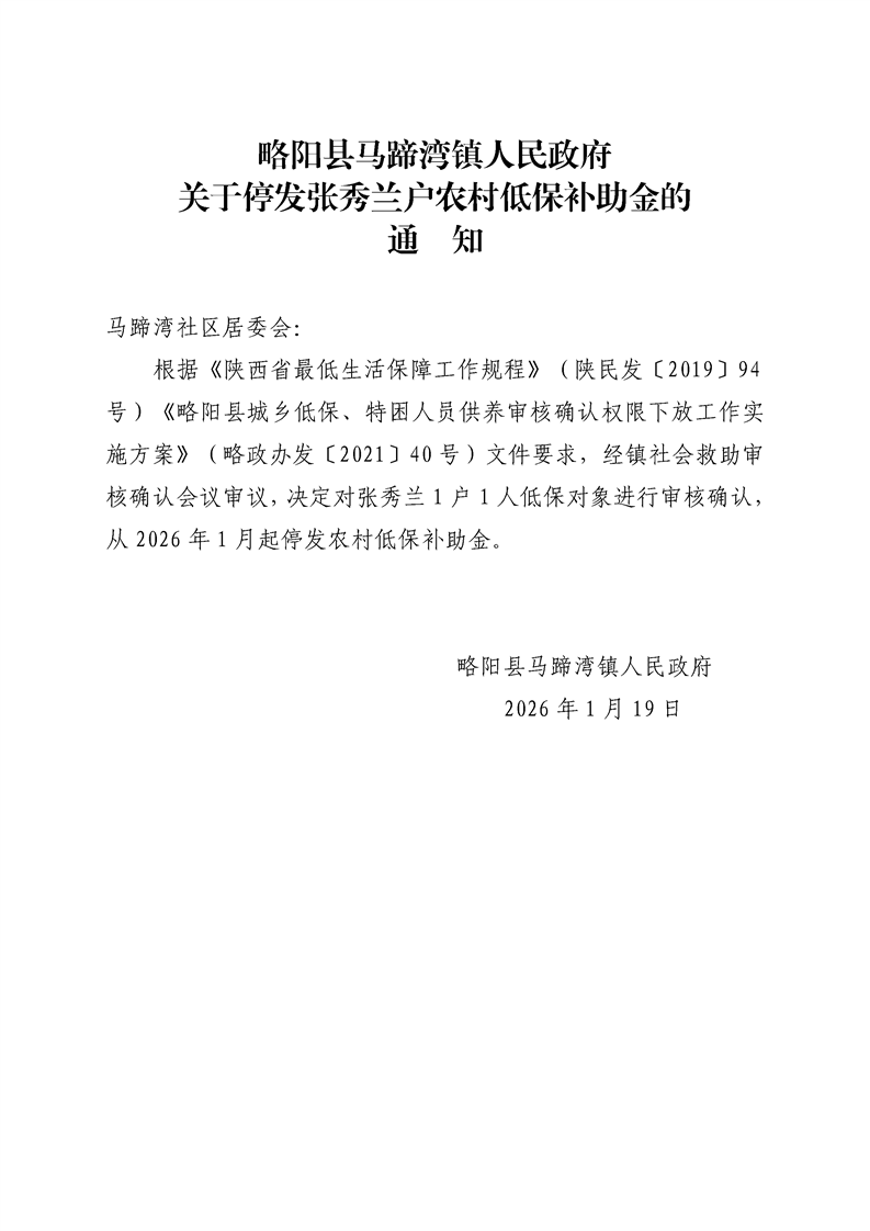 略阳县马蹄湾镇人民政府关于停发张秀兰户农村低保补助金的通知