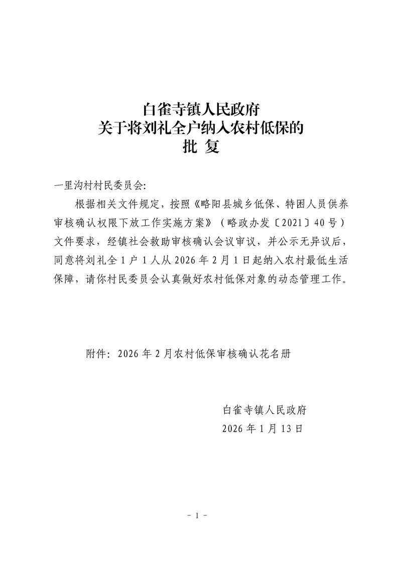 白雀寺镇人民政府关于将刘礼全户纳入农村低保的批复