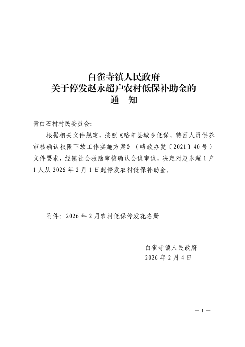 白雀寺镇人民政府关于停发赵永超户农村低保补助金的通知