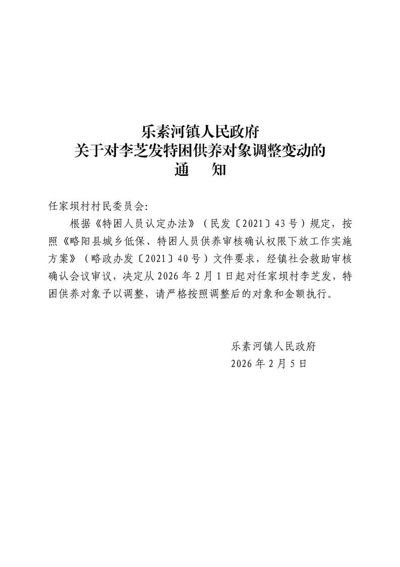 乐素河镇人民政府关于对李芝发特困供养对象调整变动的通知