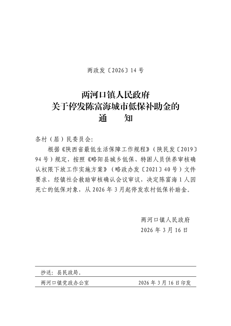 两河口镇人民政府关于停发陈富海城市低保补助金的通知