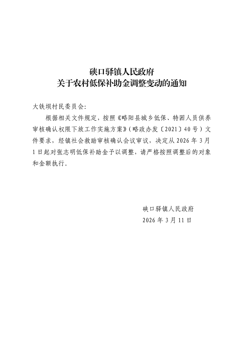 硖口驿镇人民政府关于农村低保补助金调整变动的通知