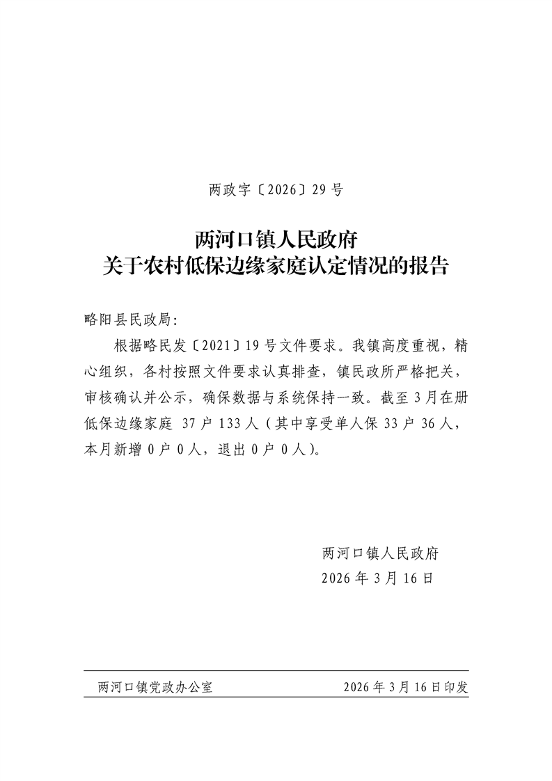 两河口镇人民政府关于农村低保边缘家庭认定情况的报告
