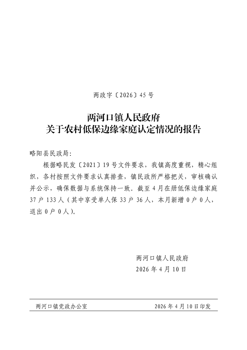 两河口镇人民政府关于农村低保边缘家庭认定情况的报告