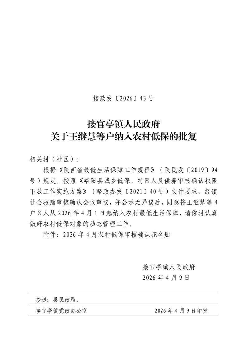 接官亭镇人民政府关于王继慧等户纳入农村低保的批复