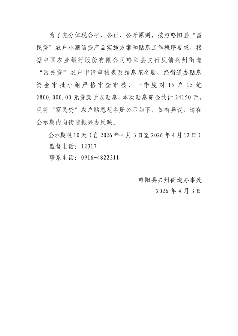 略阳县兴州街道办事处2026年一季度“富民贷”农户贴息公示