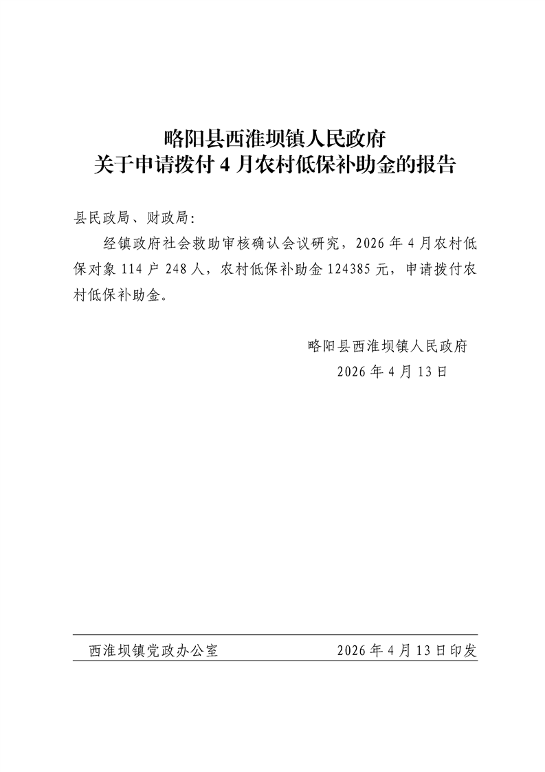 西政字〔2026〕31号西淮坝镇人民政府关于申请拨付4月农村低保补助金的报告