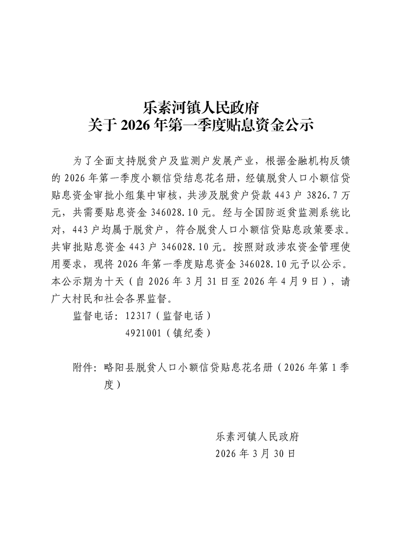 乐素河镇人民政府关于2026年第一季度贴息资金公示