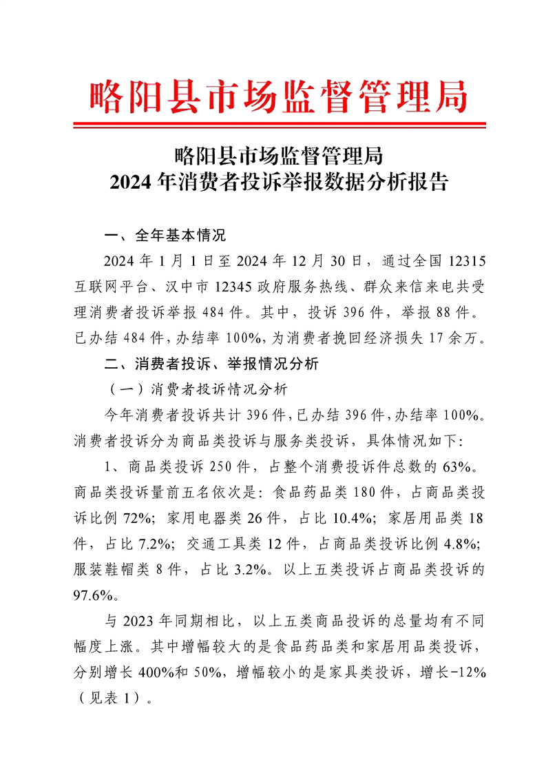 略阳县市场监督管理局2024年消费者投诉举报数据分析报告