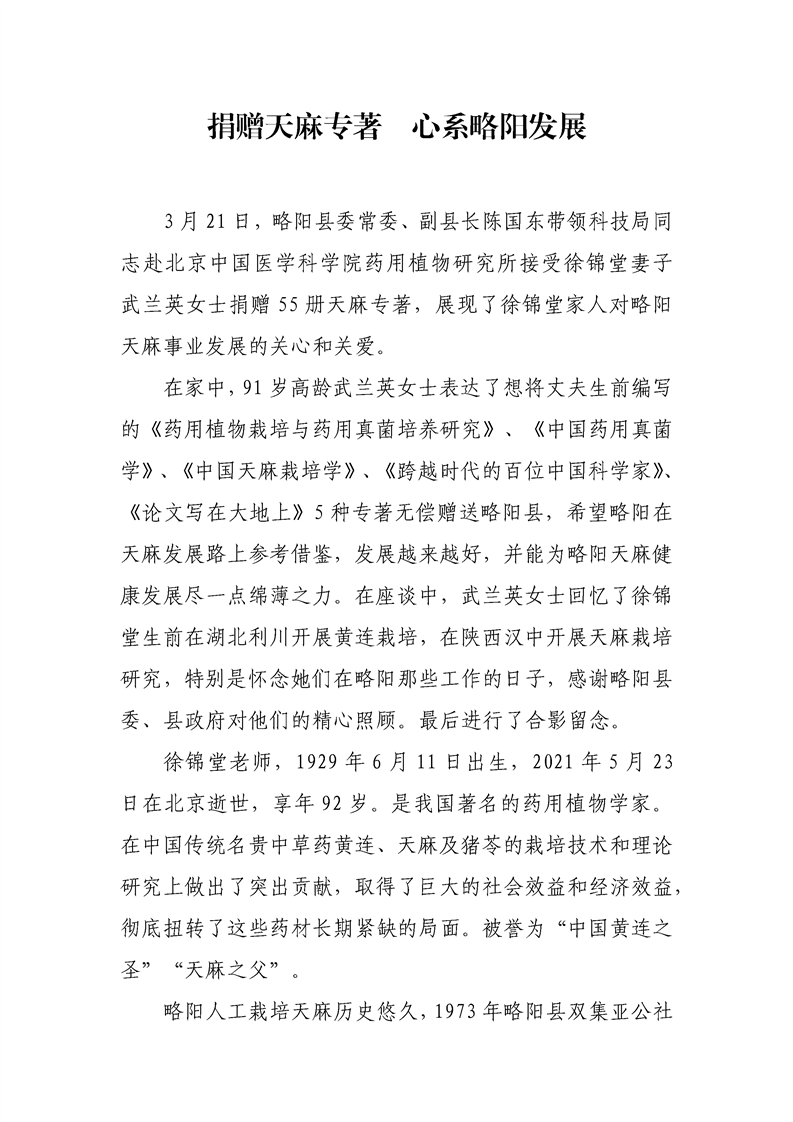 捐赠天麻专著 心系略阳发展