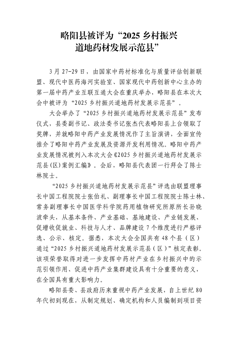 略阳县被评为“2025乡村振兴道地药材发展示范县”
