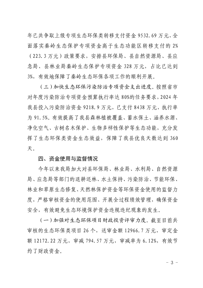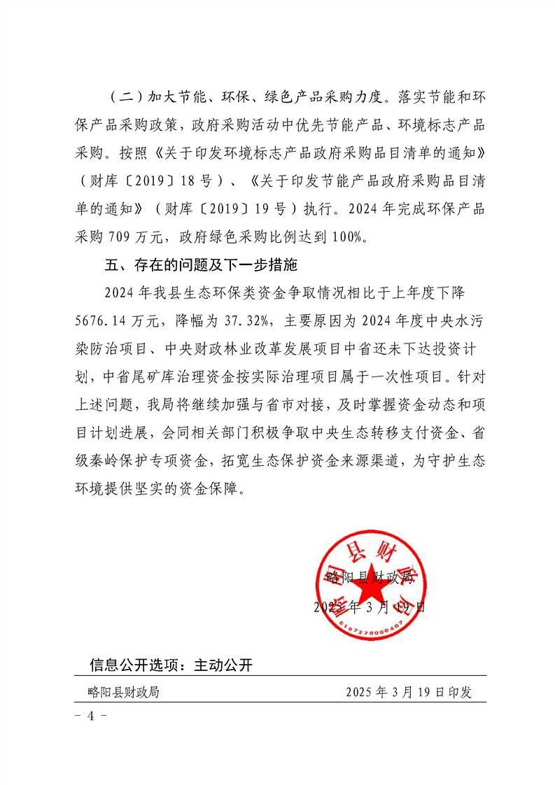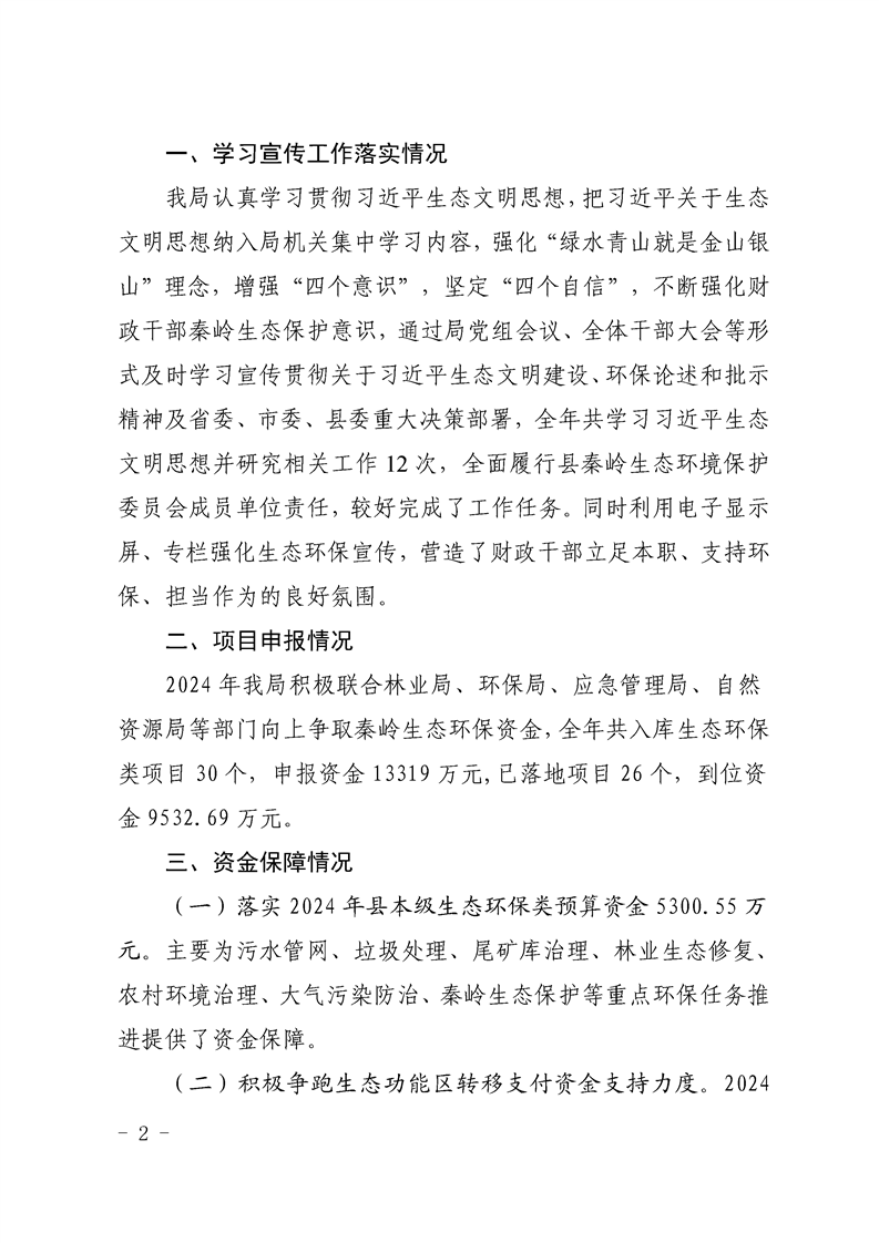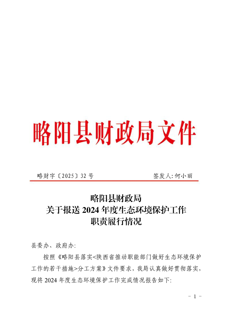 略阳县财政局关于报送2024年度生态环境保护工作职责履行情况