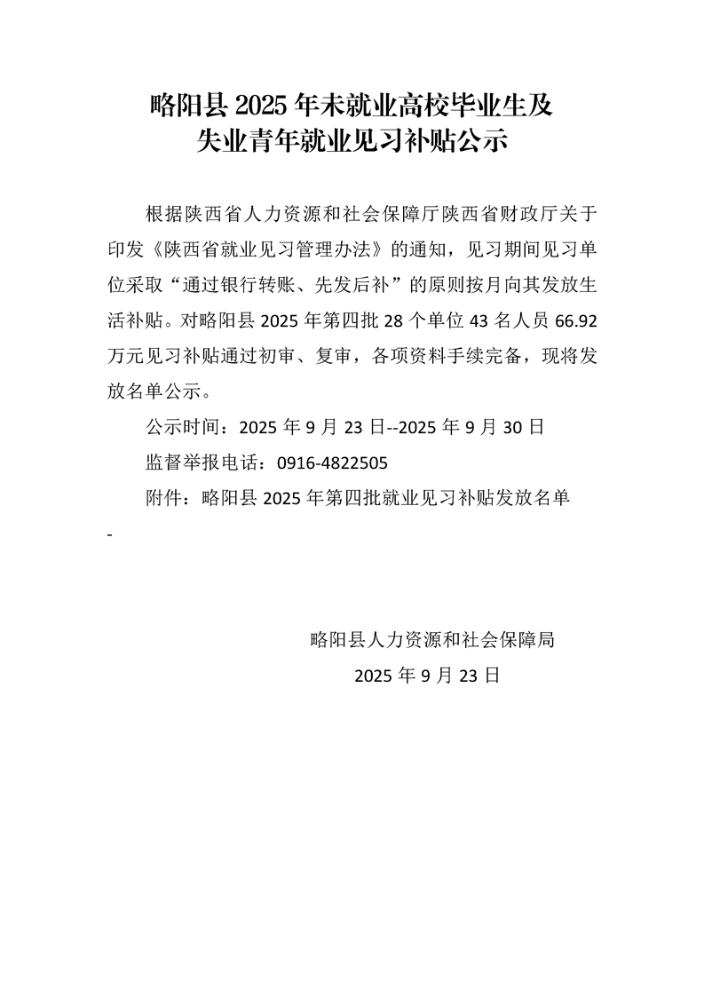 略阳县2025年未就业高校毕业生及失业青年就业见习补贴公示