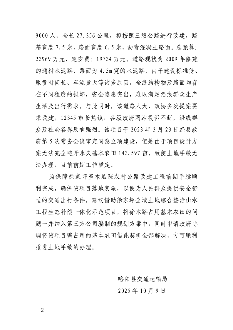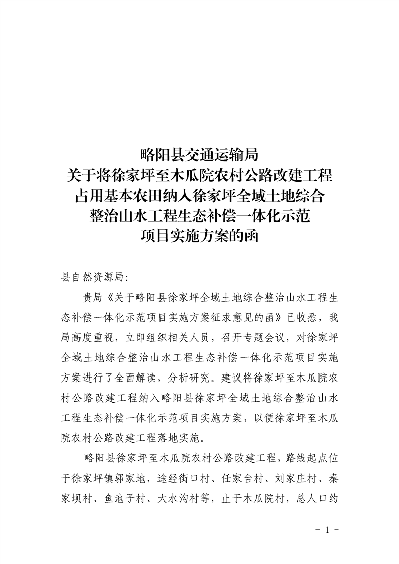 | 内容概述 | 关于将徐家坪至木瓜院农村公路改建工程占用基本农田纳入徐家坪全域土地综合整治山水工程生态补偿一体化示范项目实施方案的函 | ||||